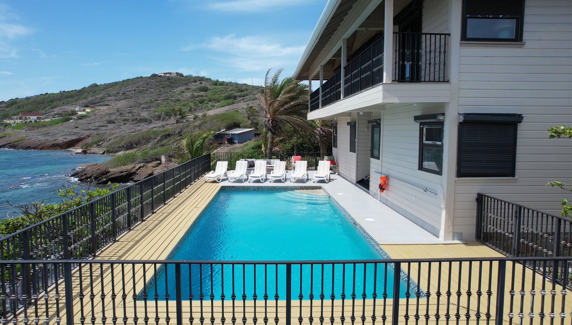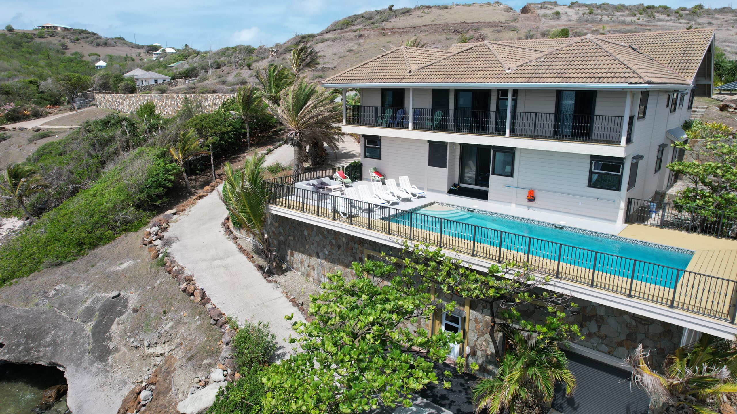 Perched on a rocky hill with direct bay access, the house is accessible via a mile of unpaved road best navigated by a 4-wheel drive. The journey rewards with privacy and a breathtaking open-plan main room adorned with cathedral ceilings, two lounge areas, kitchen, and dining table. Off this room are two master bedrooms and a bunkroom. Downstairs, two additional bedrooms, a pool deck, sports bar, and lounge area await. The expansive pool deck offers the perfect setting to soak in the Caribbean sun.